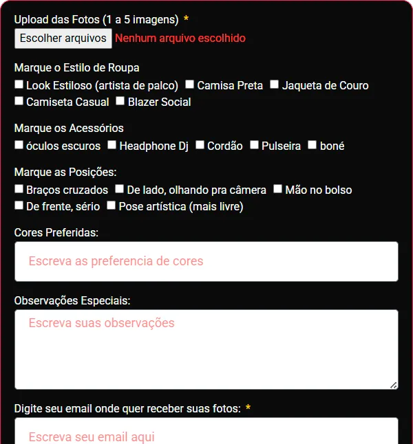 👉 Não! Você só precisa mandar algumas fotos simples (até de celular). Nós usamos IA avançada para transformar em ensaios profissionais.